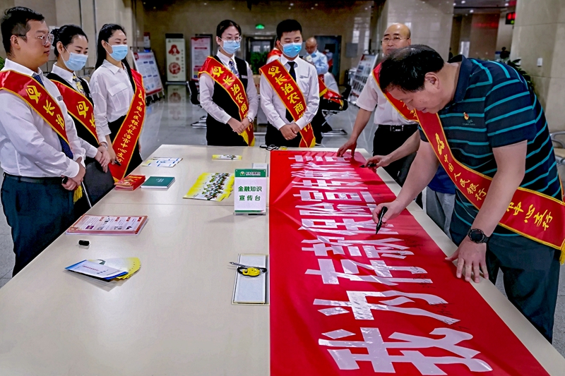 5月28日,人行山西长治市中支联合长治市金融办,组织辖内9家银行业金融机构在长治市政务中心举办了“学党史 践初心 办实事”存款保险宣传进机关专题活动。活动通过多渠道向社会公众普及了存款保险相关知识,增强了金融消费者对存款保险制度的认知度。图为参加活动的工作人员在“我为存款保险宣传做代言”条幅上签名。 本报记者 刘志良 摄