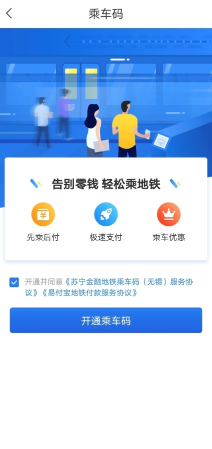 用户下载并登录苏宁金融APP,点击首页付款码–乘车码,开通无锡地铁乘车码,即可刷码乘车。
