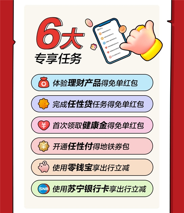 2、任务专享。用户可以通过体验苏宁金融理财产品、完成任性贷借款、首次领取健康金等任务获得地铁免单红包。此外,开通任性付可得20元乘车券包,使用零钱宝、使用苏宁银行卡可享出行立减优惠。
