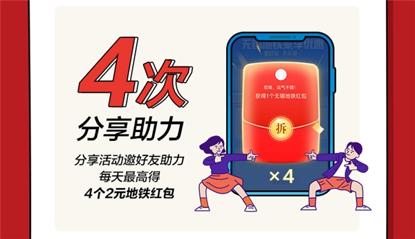 3、邀请好友助力。发起人在活动发起24小时内邀请好友,每邀请3人领取,发起人得1个2元地铁红包奖励,同一用户每天最多可领4个助力奖励。