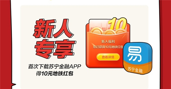 值得一提的是,新用户还有专享福利。苏宁金融APP新用户(指从未登录过苏宁金融APP的用户),首次下载APP并完成实名认证,可一次性领取5个2元地铁红包。同一用户最多可领1次。