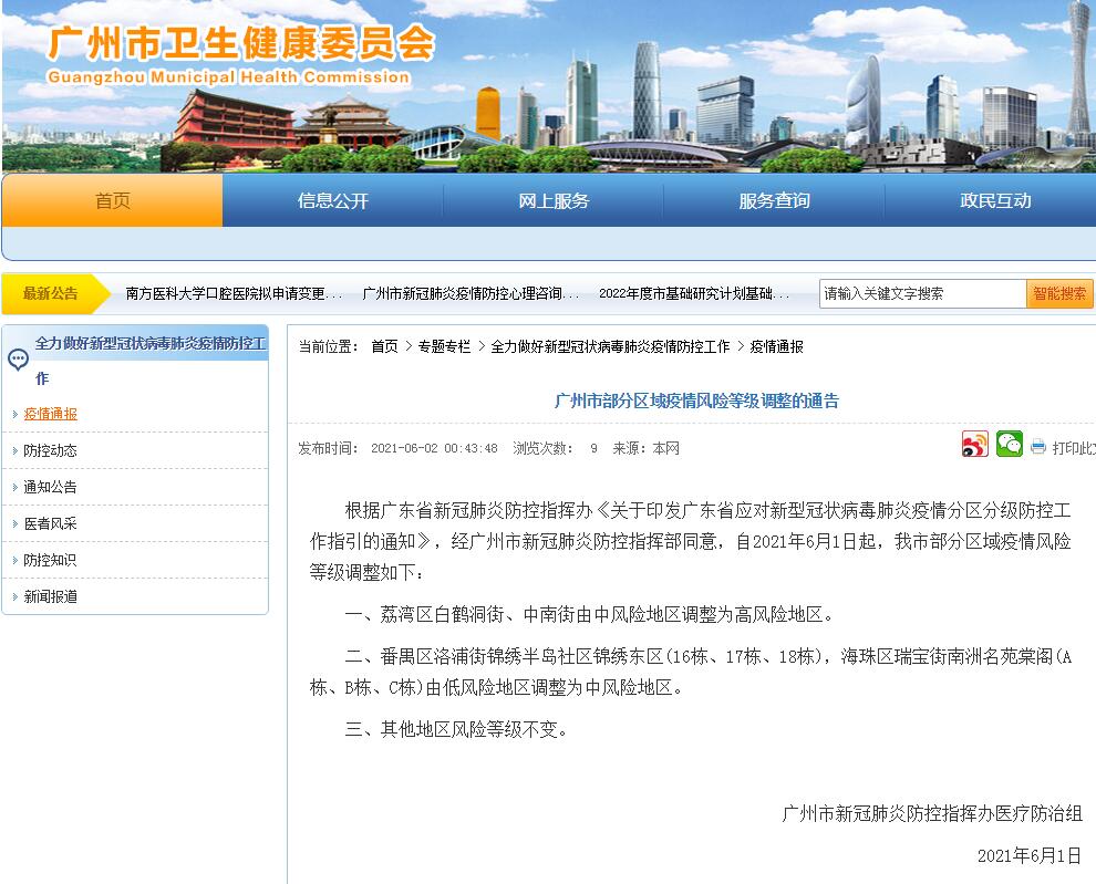 广州市新冠肺炎防控指挥办医疗防治组指出,根据广东省新冠肺炎防控指挥办《关于印发广东省应对新型冠状病毒肺炎疫情分区分级防控工作指引的通知》,经广州市新冠肺炎防控指挥部同意,自2021年6月1日起,广州市部分区域疫情风险等级调整如下: