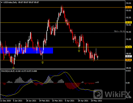 日线图显示美元指数温和反弹,当前企稳于89.60区间支撑。从MACD来看,快慢线略拐向上行,白色动能柱温和增量。指数走势基本和动能柱的变化一致。