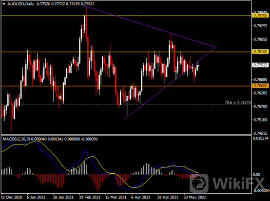 日线图显示澳元兑美元震荡上涨,当前回测三角趋势线阻力。从MACD来看,快慢线略呈平行,红色动能柱温和收敛。汇价走势基本和动能柱的变化一致。