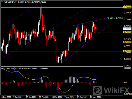 日线图显示纽元兑美元回吐隔夜部分涨幅,当前仍企稳于0.7220支撑。从MACD来看,快慢线略呈拐向,白色动能柱温和收缩。汇价走势基本和动能柱的变化一致。