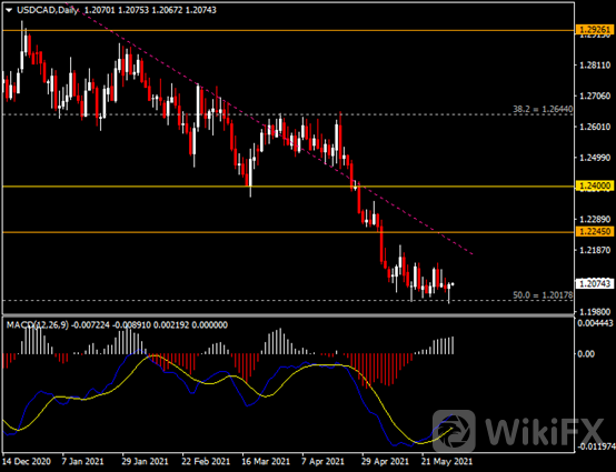 日线图显示美元兑加元企稳反弹,当前收于1.2020支撑。从MACD来看,快慢线向上扩张,白色动能柱温和放量。汇价走势基本和动能柱的变化一致。
