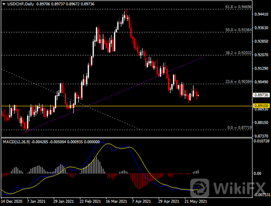 日线图显示美元兑瑞郎震荡下挫,当前仍承压于0.9040阻力。从MACD来看,快慢线金叉依旧,白色动能柱温和增量。汇价走势和动能柱的变化呈分歧。