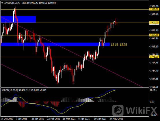 日线图显示金价小幅收低,当前回测前高1900。从MACD来看,快慢线欲形成死叉,白色动能柱收缩殆尽。金价走势基本和动能柱的变化一致。