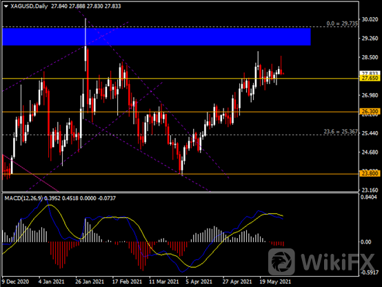 日线图显示银价高位回落,当前仍收于27.65支撑。从MACD来看,快慢线向下运行,红色动能柱温和增量。银价走势基本和动能柱的变化一致。