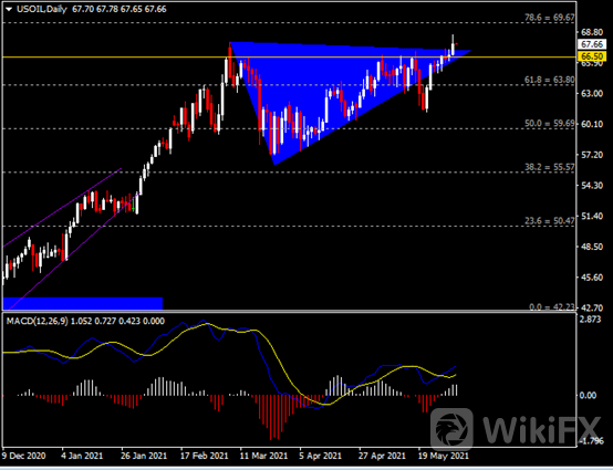 昨日,欧佩克+在会议中一致决定保持原有的增产计划不变,即在6月和7月分别每日增产35万桶和44.1万桶。同时,沙特亦表示将持续解除其100万桶/日的自愿减产计划。无论如何,该组织宣布增产的消息并没有对油市造成利空影响。美原油一度上破今年3月所录得的高点67.89美元(同时也是今年全年高点),截至收盘,报67.68美元/桶;布伦特原油日内亦录得近3%的涨幅至最高71.30美元,为3月8日以来首次触及71美元水平。