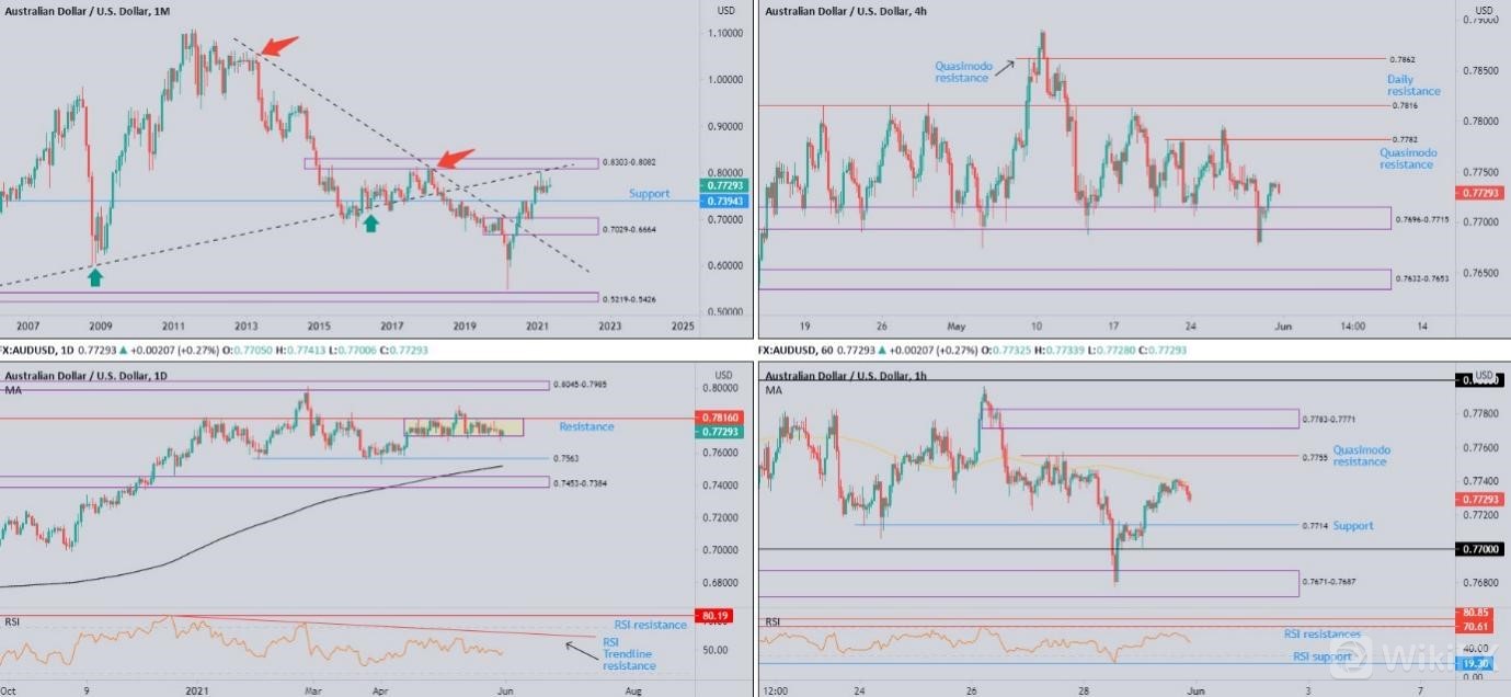 1. 1小时级别回踩0.7714支撑吸引了逢低买盘,然后测试0.7782的阻力。日线级别的低点反弹区域也在0.7699。