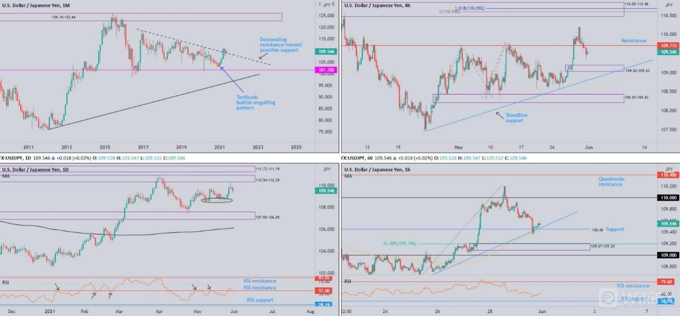 阻力方面109.71是最近的阻力;上方还有110.85-110.46的供给区域,以及日线级别阻力110.94-110.29.4小时级别上100%斐波那契反向扩展位在110.59,同时161.8%的扩展位在110.69。