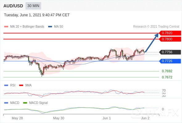 澳元/美元 当日内: 看涨,当 0.7726 为支撑位。 0.7726 作为转折点。 交易策略:看涨,当 0.7726 为支撑位。备选策略:如跌破 0.7726 ,AUD/USD 目标方向定在 0.7692 和 0.7672 。 技术点评 :RSI技术指标超过50。 MACD技术指标呈现看多状态并 处在其信号线的上方。 此外,价位高于其20天及50天移动平均线 ( 分别位于 0.7751 和 0.7748 )。