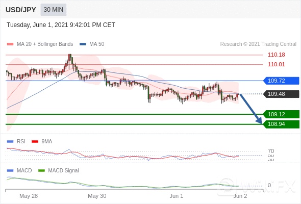 美元/日元 当日内: 逐渐下行,当 109.72 为阻力位时,目标位定在 108.94 。 109.72 作为转折点。 交易策略:逐渐下行,当 109.72 为阻力位时,目标位定在 108.94 。 备选策略:向上突破 109.72 ,将带来继续上行的趋势,目标位定在 110.01 和 110.18 。 技术点评 :RSI技术指标大于中性区域50。 MACD技术指标呈现看跌状态并 处在其信号线的下方。 此外,价位低于其20天及50天移动平均线 ( 分别位于 109.49 和 109.49 )。
