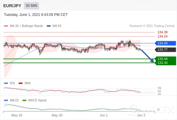 欧元/日元 当日内: 看跌,在 134.00 之下。 转折点为:134.00 交易策略:看跌,在 134.00 之下。备选策略:如突破 134 ,EUR/JPY 目标方向为 134.24 和 134.39 。 技术点评 :RSI技术指标低于50。 MACD技术指标呈现看跌状态并 处在其信号线的下方。 此外,价位处在其20天及50天移动平均线下方 ( 当前是 133.92 和 133.90 )。