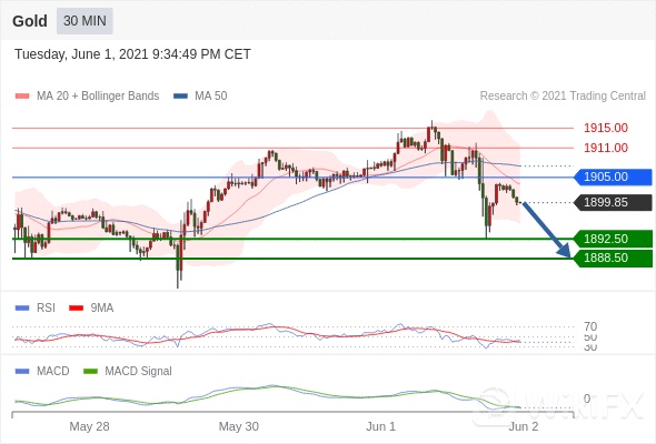Gold 当日内: 看跌,在 1905.00 之下。 转折点为:1905.00 交易策略:看跌,在 1905.00 之下。备选策略:向上突破 1905 ,将带来继续上行的趋势,目标位定在 1911 和 1915 。 技术点评 :RSI技术指标低于50。 MACD技术指标处在其信号线之下 看空。 此外,价位低于其20个时期及50个时期移动平均线 ( 分别位于 1903.63 和 1907.30 )。