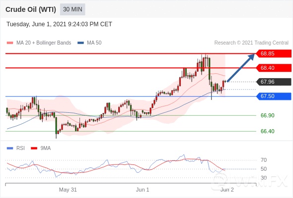 原油 (WTI)(N1)当日内: 超短线(当日内)支撑位在67.50附近。转折点:67.50 交易策略:在 67.50 之上,看涨,目标价位为 68.40 ,然后为 68.85 。 备选策略:在 67.50 下,看空,目标价位定在 66.90 ,然后为 66.40。 技术点评:RSI技术指标在50%中性区域下方,并向上反转。