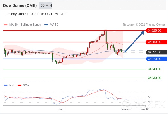 美国道琼斯30指数 (M1)当日内: 超短线(当日内)支撑位在34470.00附近。转折点:34470.00 交易策略:在 34470.00 之上,看涨,目标价位为 34680.00 ,然后为 34825.00 。 备选策略:在 34470.00 下,看空,目标价位定在 34340.00 ,然后为 34230.00。 技术点评:RSI技术指标在50%中性区域下方,并向上反转。