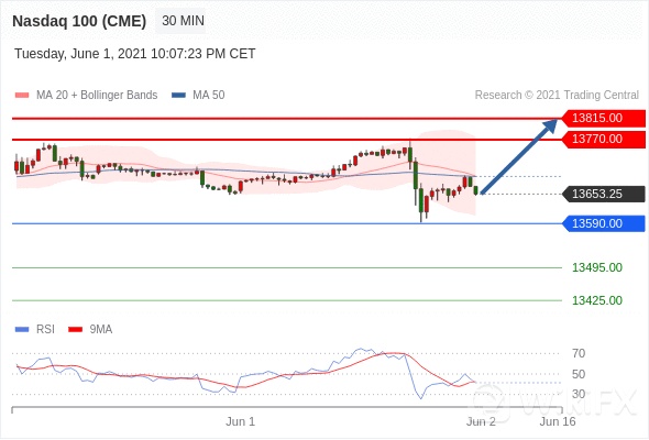 美国纳斯达克100指数期货 (M1)当日内: 上升空间有限。转折点:13590.00 交易策略:在 13590.00 之上,看涨,目标价位为 13770.00 ,然后为 13815.00 。 备选策略:在 13590.00 下,看空,目标价位定在 13495.00 ,然后为 13425.00。 技术点评:其即时趋势维持向上,但缺乏动能。