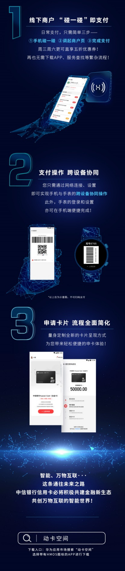 (4)动卡空间APP(HarmonyOS版)V1.0版:这是信用卡行业首批HarmonyOS系统原生APP,该应用覆盖目前全部的信用卡基础服务,包括申卡、开卡激活、查账还款、额度管理、积分管理、分期服务、信收付、生活服务等,充分发挥HarmonyOS的架构优势,为用户提供更加顺畅、稳定的信用卡服务。近期,用户将可在华为应用市场搜索“动卡空间”下载体验。
