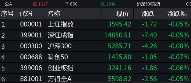 截至开盘,沪指跌0.05%,报3595.42点;深成指跌0.05%,报14850.51点;创业板指跌0.06%,报3241.16点。