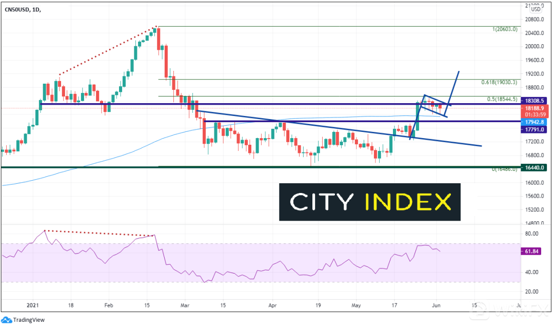 如果中国经济继续复苏且股指确实持续走高,中国A50指数的首要目标是击穿旗形,如果确实触达19260附近的目标,很可能拾阶而上,摸至2月创下的历史高点。Forex