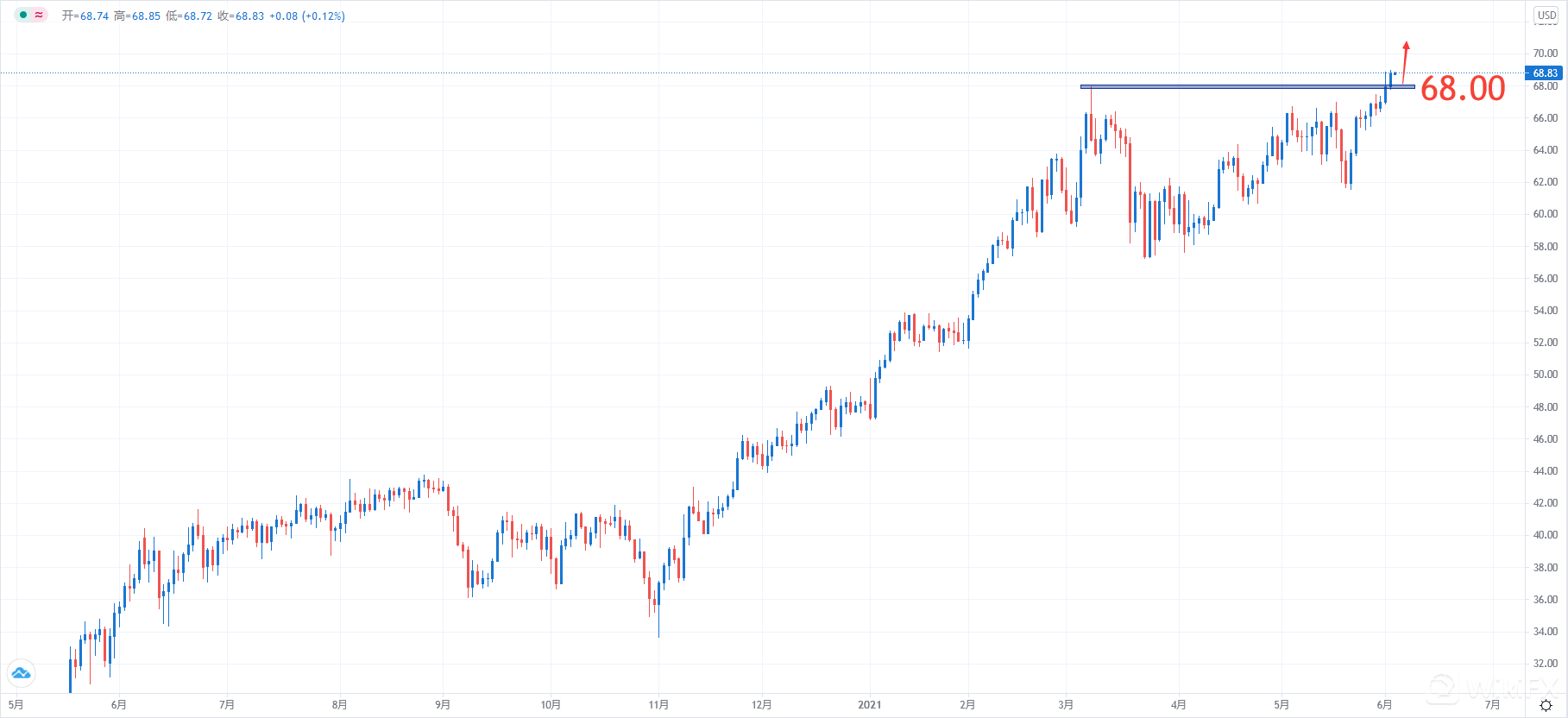 【交易策略】:目前市场格局呈现多头流向,建议投资者可考虑关注68.00附近做多,止损67.00附近,止盈70.50附近。