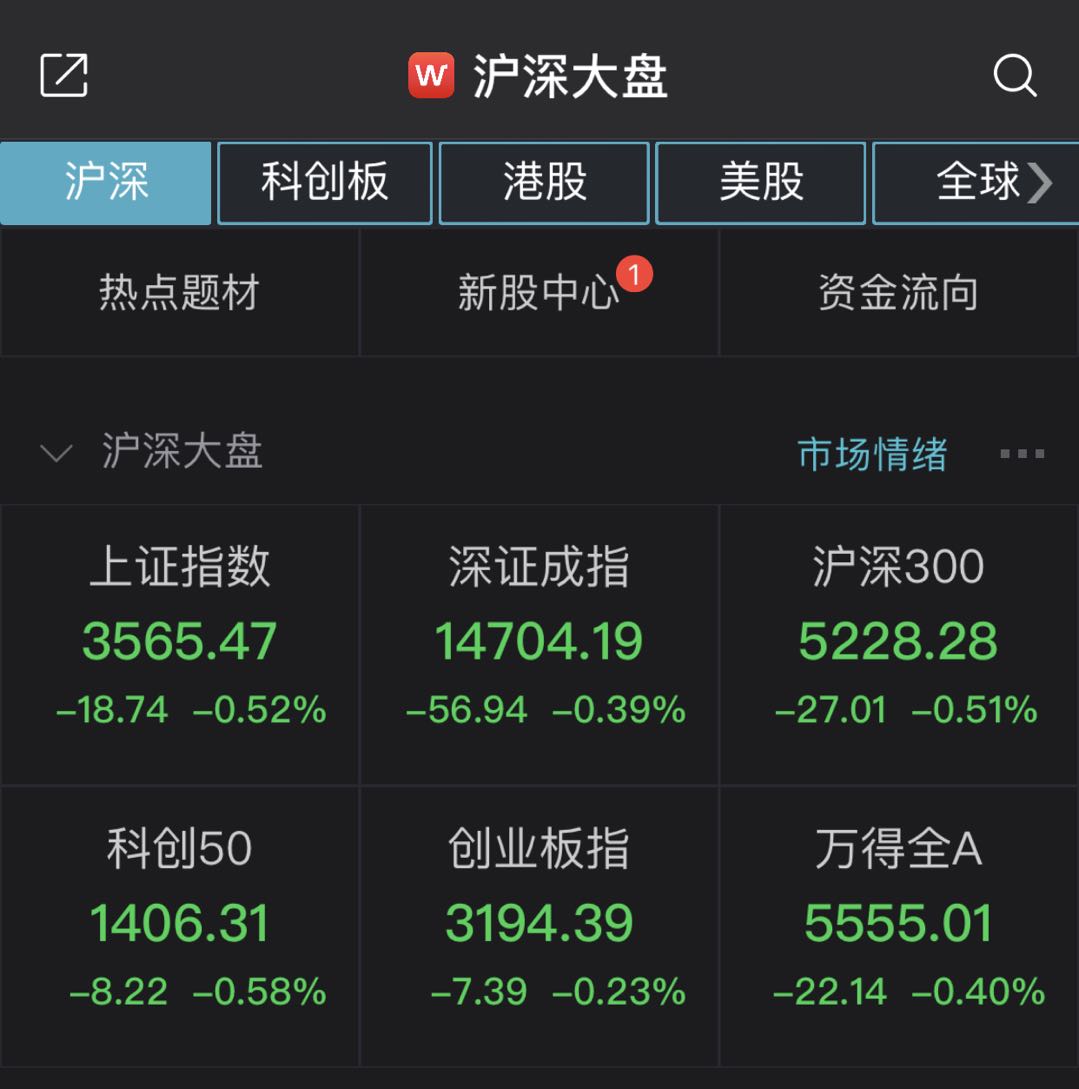 截至开盘,沪指低开3565.47点,跌幅0.52%,成交额44.66亿元;深成指报14704.19点,跌幅0.39%,成交额40.63亿元;创业板指报3194.39点,跌幅0.23%。