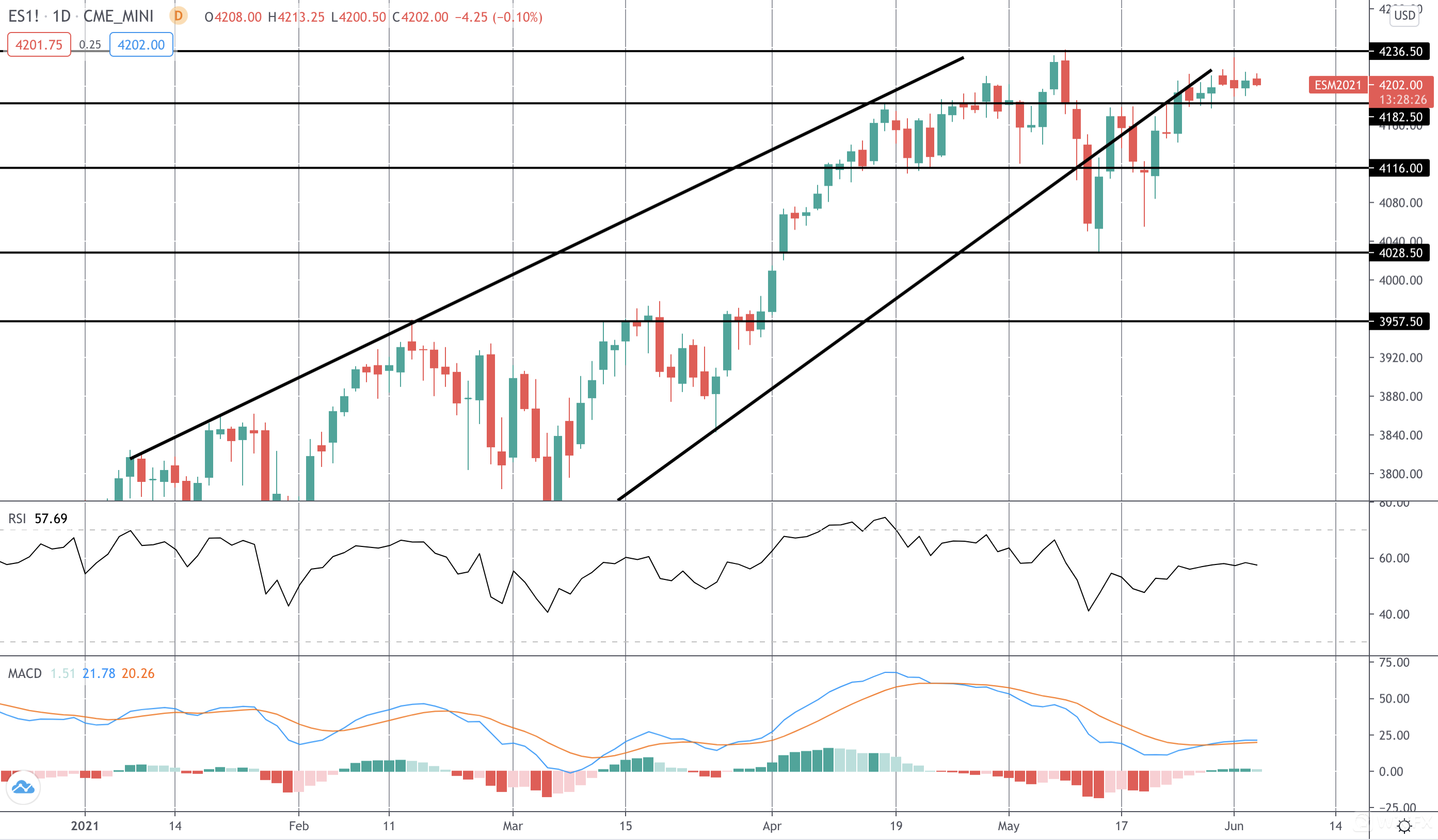 在明天的数据公布之前,股市在高点附近盘整。如果美元走高,股市可能会大幅跌破 4182.50 水平。鉴于 MACD 和 RSI 均出现看跌背离,此举可能很快会测试 4116 水平。或者,如果美元下跌,我们可能会看到突破 4236.50 水平。