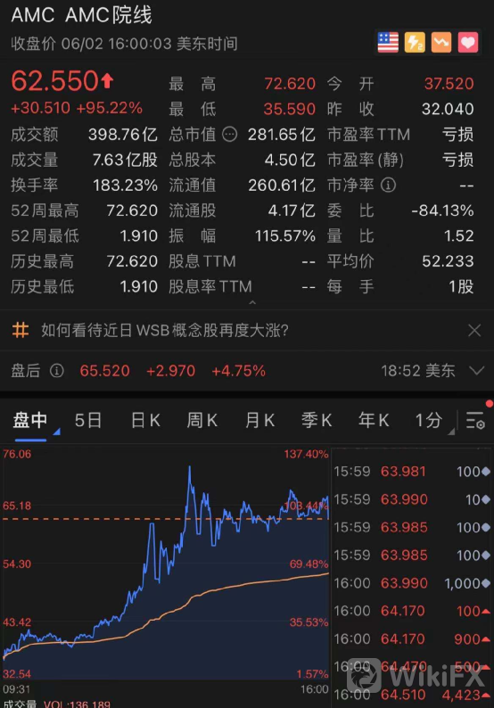 北京时间5月23日周日,万达刚官宣退出AMC董事会并仅保留少数股权,美东时间24日周一,AMC立马涨超13%;接下来的周二、周三两个交易日,AMC均涨超19%;当周周四,AMC大涨35%,周五AMC股价有所回调,但仅收跌1.5%。