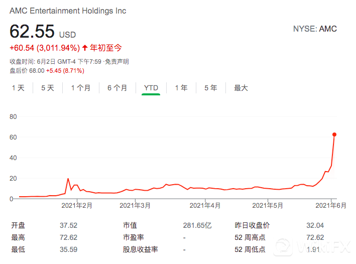 周三,AMC盘中几次触发熔断,至收盘股价几近翻倍,站上60美元,使之市值达到281亿美元,超过标普500指数近一半成分股。短短几个月时间,AMC市值从不到5亿的小盘股荣升大盘,年内涨幅盘中一度超过3000%,成为30倍股。