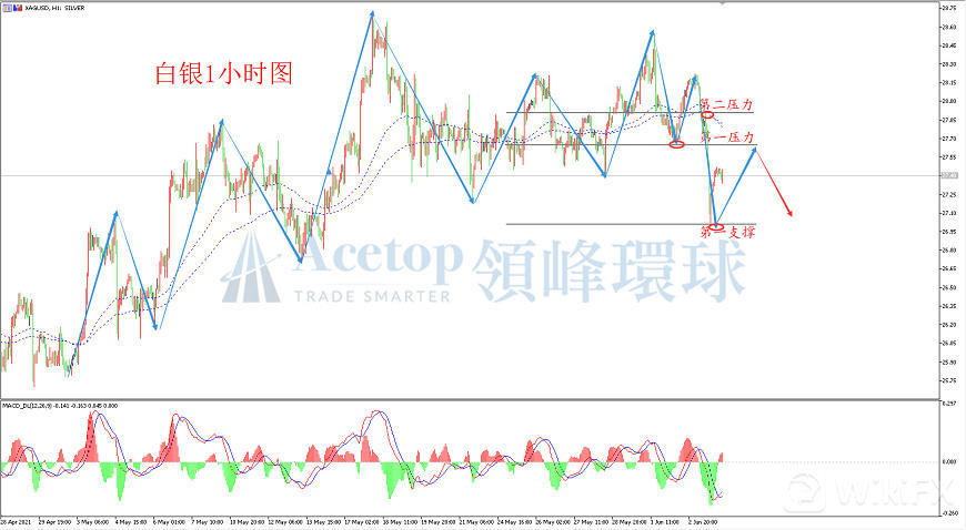 从上图白银一小时图形上看,银价昨日跌破了前期盘整区间的底部,创出近期新低;从MACD指标上来看,快慢线在零轴上方形成死叉下穿零轴,并创出新低,未出现背离信号,是较为明显的空头走势。从四小时图形上看,银价昨日的下跌也击穿了80、144日均线,也预示后市有较高的概率延续空头走势。建议日内采取做空的思路进行操作,空单入场可以参考27.60区间,该位置压力较大。