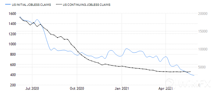 至5月29日当周初请失业金人数录得38.5万人,续刷去年3月14日当周以来新低,两周前的续请失业金人数也保持低位趋势。