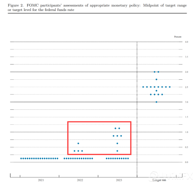 (2021年3月份公布的加息预期点阵图)