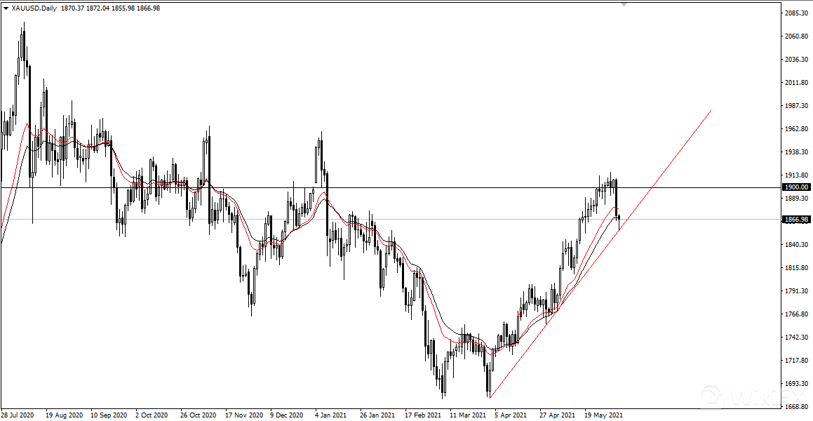 黄金在多头不断努力下,还是无法保持在1900美元上方,昨日大幅下挫跌至今年3月底以来的上升趋势线。
