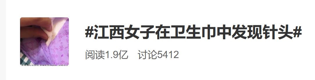 6日下午,#江西女子在卫生巾中发现针头#话题冲上微博热搜第一,截至发稿,该话题阅读量近2亿。据报道,江西一女子称自己购买的七度空间卫生巾内发现针头,约有正常针的三分之一。此新闻一出,网友瞬间炸锅,尤其是购买过“七度空间”品牌的女性消费者。