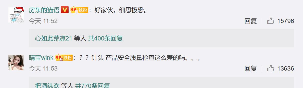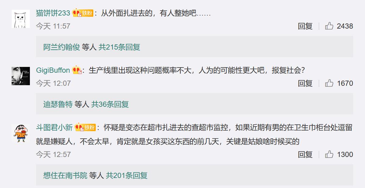 大量网友在评论区表示担忧,“细思极恐,也太吓人了……”“一定要查清楚这针头怎么放进去的!是工厂的疏忽还是超市有人做手脚……这种尖刺的异物放在卫生巾里,太可怕。”一位网友直言:“拔草了!!!以后不用这个牌子”。