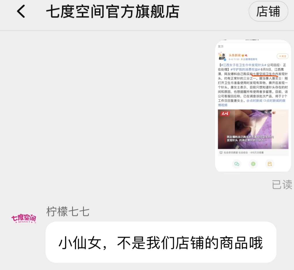 另外,中新经纬客户端以消费者的身份向七度空间淘宝官方旗舰店咨询,客服人员表示,此事正在核实中。新闻报道中的消费者是从线下渠道购买的卫生巾,“不是我们店铺的商品。”此外,七度空间高端线产品Space7旗舰店客服也给予同样回应,“公司还在调查中。”