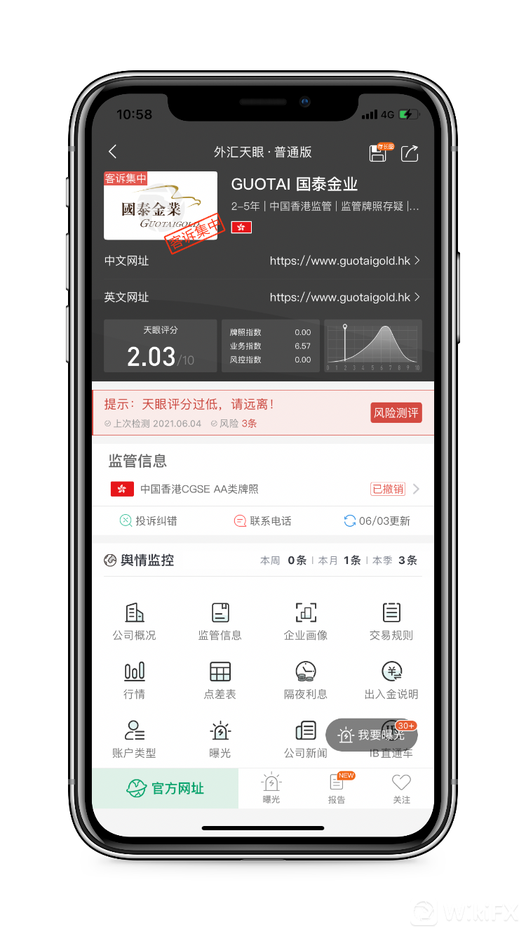 GUOTAI 国泰金业,天眼评分2.03分,所持牌照被撤销后,当前没有任何实际有效监管,天眼早前就曝光了该黑黑平台的恶行,存在巨大风险,建议投资者提高警惕。