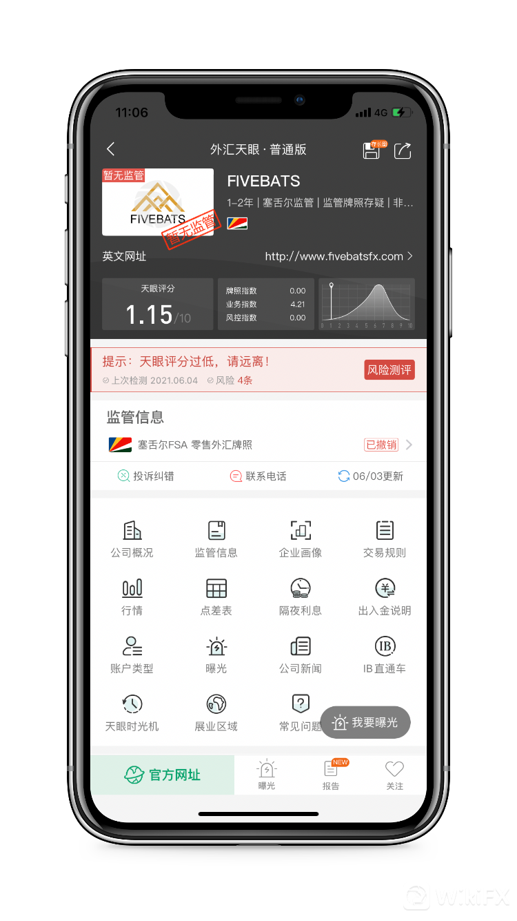 FIVEBATS,天眼评分1.15分,所持牌照均被撤销后,当前没有任何实际有效监管,存在巨大风险,建议投资者提高警惕。