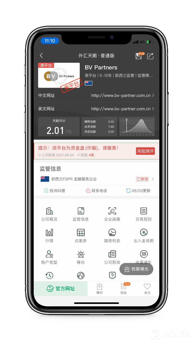 BV Partners,天眼评分2.01分,所持牌照被撤销后,当前暂无任何实际有效监管,存在巨大风险,建议投资者远离。