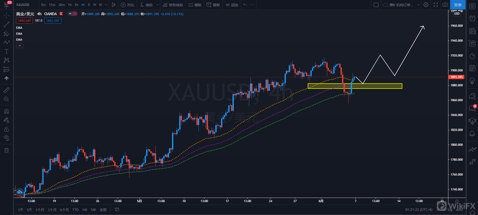 策略解析:黄金再之前一波下跌之后,价格在4小时120EMA处受到支撑,并未有效跌破均线系统,在之后又出现V反走势,因此,黄金之前的下跌大概率只是一个回踩的假摔行情,后续或将继续回归上涨趋势,继续逢低买入黄金。日内关注价格再次回踩1882.50-1875.50区域的机会,可择机逢低买入黄金,上看目标1930、1960一线甚至更高。