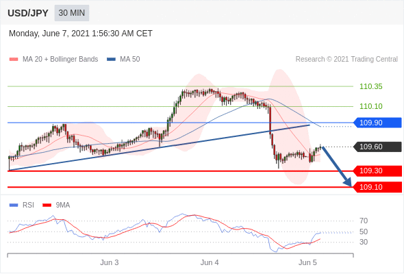 美元/日元 当日内: 短期关键阻力位在109.90。