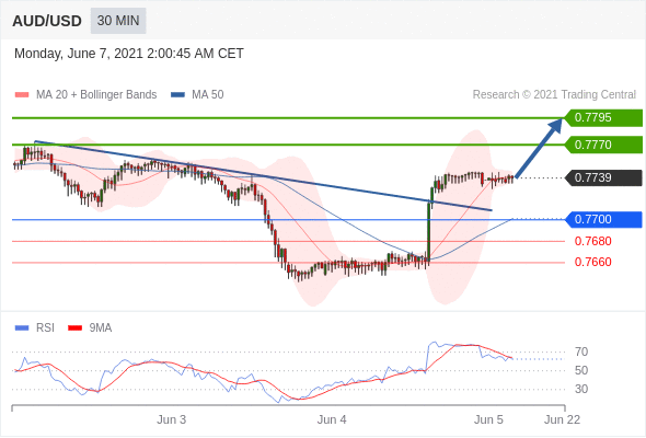 交易策略: 在 0.7700 之上,看涨,目标价位为 0.7770 ,然后为 0.7795 。
