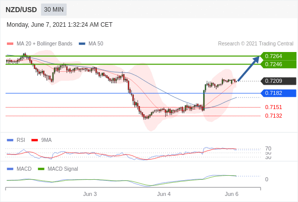 新西兰元/美元 当日内: 看涨,当 0.7182 为支撑位,目标定在0.7264。