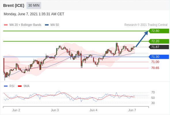 交易策略: 在 71.30 之上,看涨,目标价位为 72.20 ,然后为 72.80 。