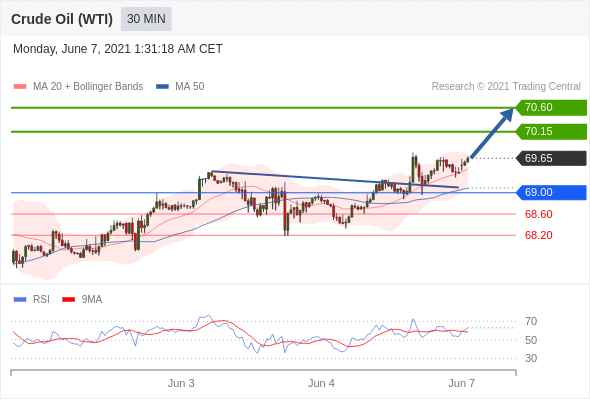 交易策略: 在 69.00 之上,看涨,目标价位为 70.15 ,然后为 70.60 。