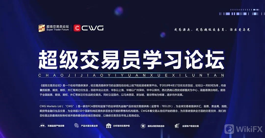 作为一家在中国在线交易市场占有率颇高的券商,不仅在成都做过分享,近年来,CWG也在不断通过组织研讨会(线上和线下)为各种背景的交易员提供金融知识,对于初学者,可以通过CWG的在线培训课程,提升和完善自身交易基础知识与结构;而对于经验丰富的交易员,CWG也提供全面的交易分析报告和技术参考指标,帮助他们更好地进行分析和交易。CWG致力为交易者提供优越的交易环境。目前已拥有来自全球100多个不同国家的用户。