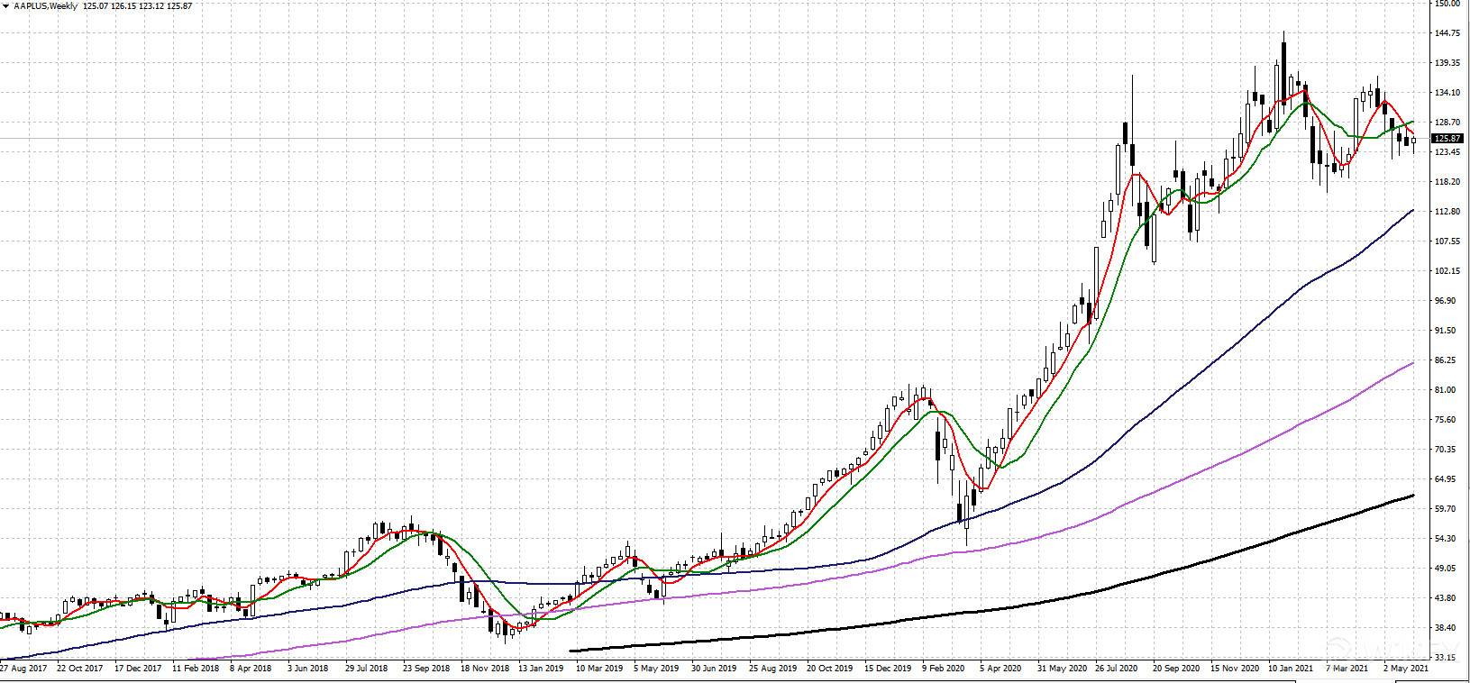 技术分析角度看,苹果周线图有回调到100美元的可能。长期趋势依然是向上运行。