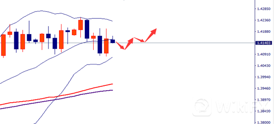 英镑周线图,英镑上周震荡回落,维持高位震荡结构,收盘在1.4150附近,周线以实体阳线收盘,本周有望高位震荡。日线图英镑受到60周期均线1.4030的支撑,市场转多头格局,目前布林带上轨1.4200有较强压力,中轨在1.4150附近,MACD指标,上涨动能开始减少,整体看,英镑本周倾向于震荡走高,关注1.4100支撑和1.4420附近压力,高抛低吸。